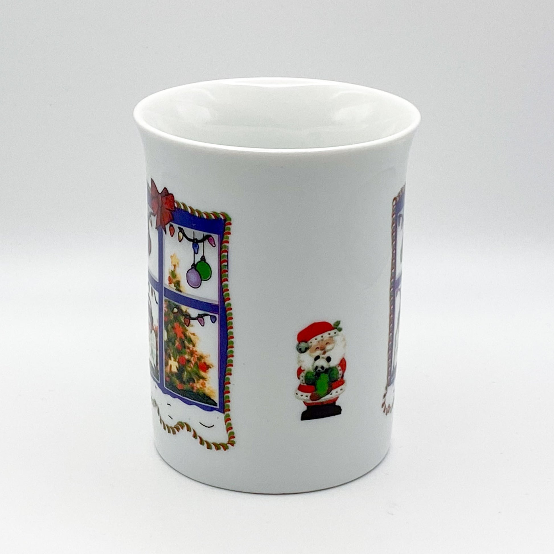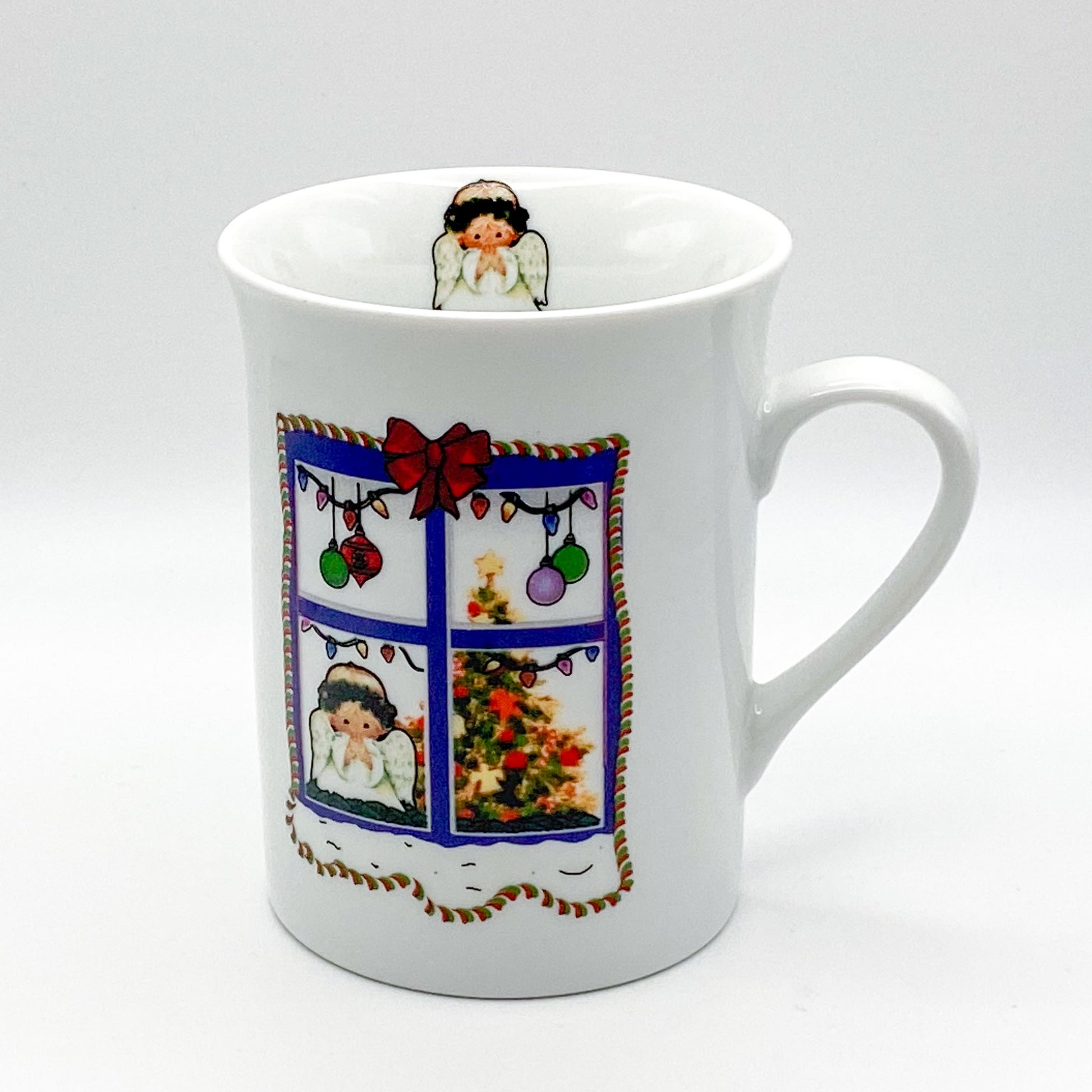 Dieser zauberhafte Weihnachtsbecher verbreitet eine wundervolle Festtagsstimmung. Die kunstvoll gestaltete Illustration zeigt ein Fenster, hinter dem ein kleiner Engel verträumt auf das festliche Geschehen blickt. Im Hintergrund strahlt ein festlich geschmückter Weihnachtsbaum, umgeben von glitzernden Kugeln und Lichterketten. Besonders liebevoll ist das Detail im Inneren des Bechers: Ein kleiner Engel, der von oben neugierig herabschaut.